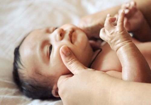 Cha hoặc mẹ có thể dùng ngón trỏ và ngón giữa chụm lại và xoa nhẹ tại khu vực quanh miệng con trong khoảng thời gian là 3 phút.